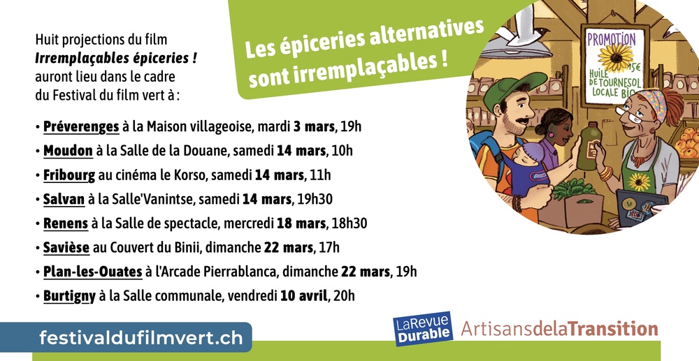 Le documentaire Irremplaçables épiceries! réalisé par Jacques Mirenowicz présente en 47 minutes la façon dont les épiceries alternatives de Suisse romande s’approvisionnent en donnant la priorité aux fermes en agroécologie et aux ateliers de transformation artisanaux, garantissent la transparence sur leurs marges raisonnables, évitent le gaspillage alimentaire, luttent contre les emballages, assurent un contact privilégié avec la clientèle et...
